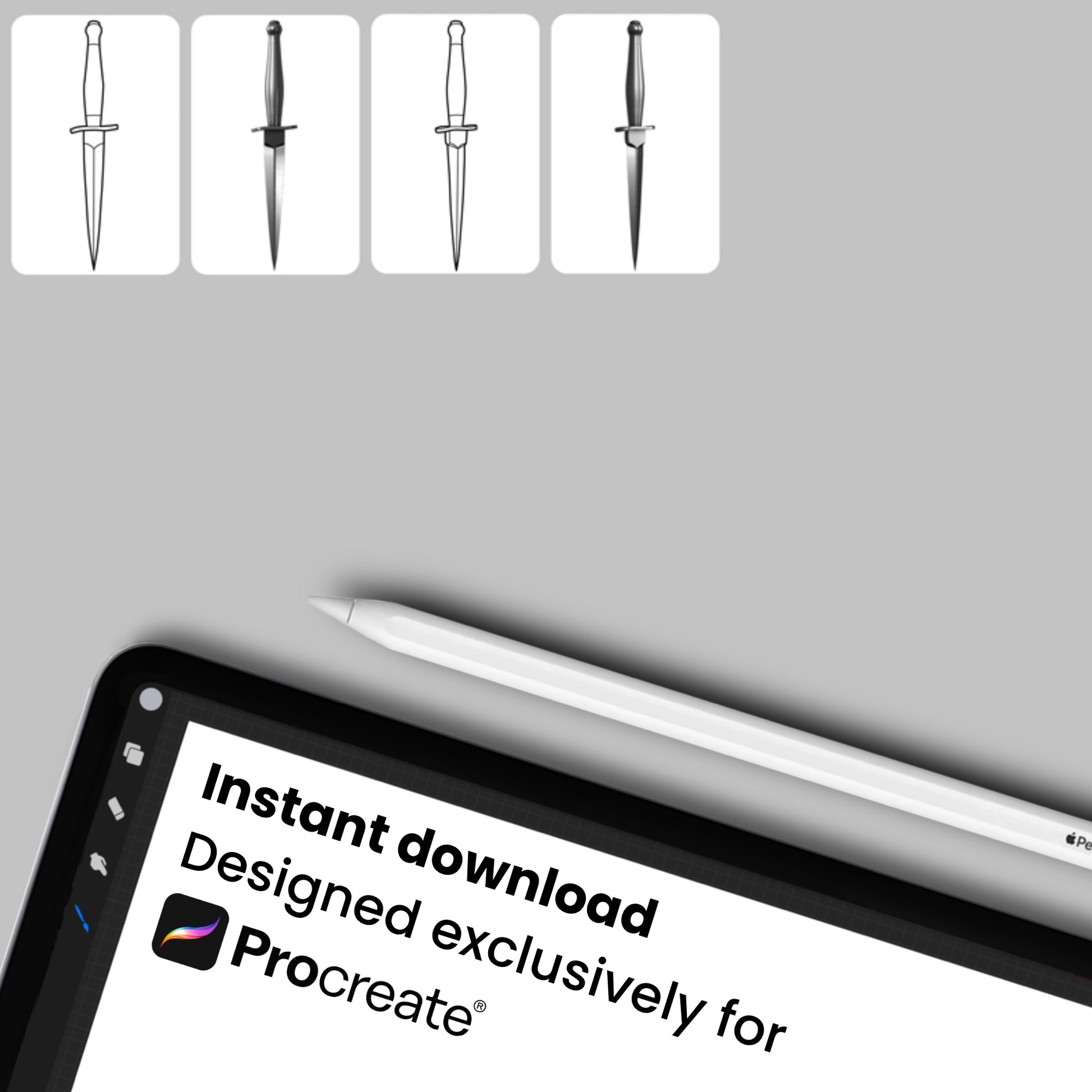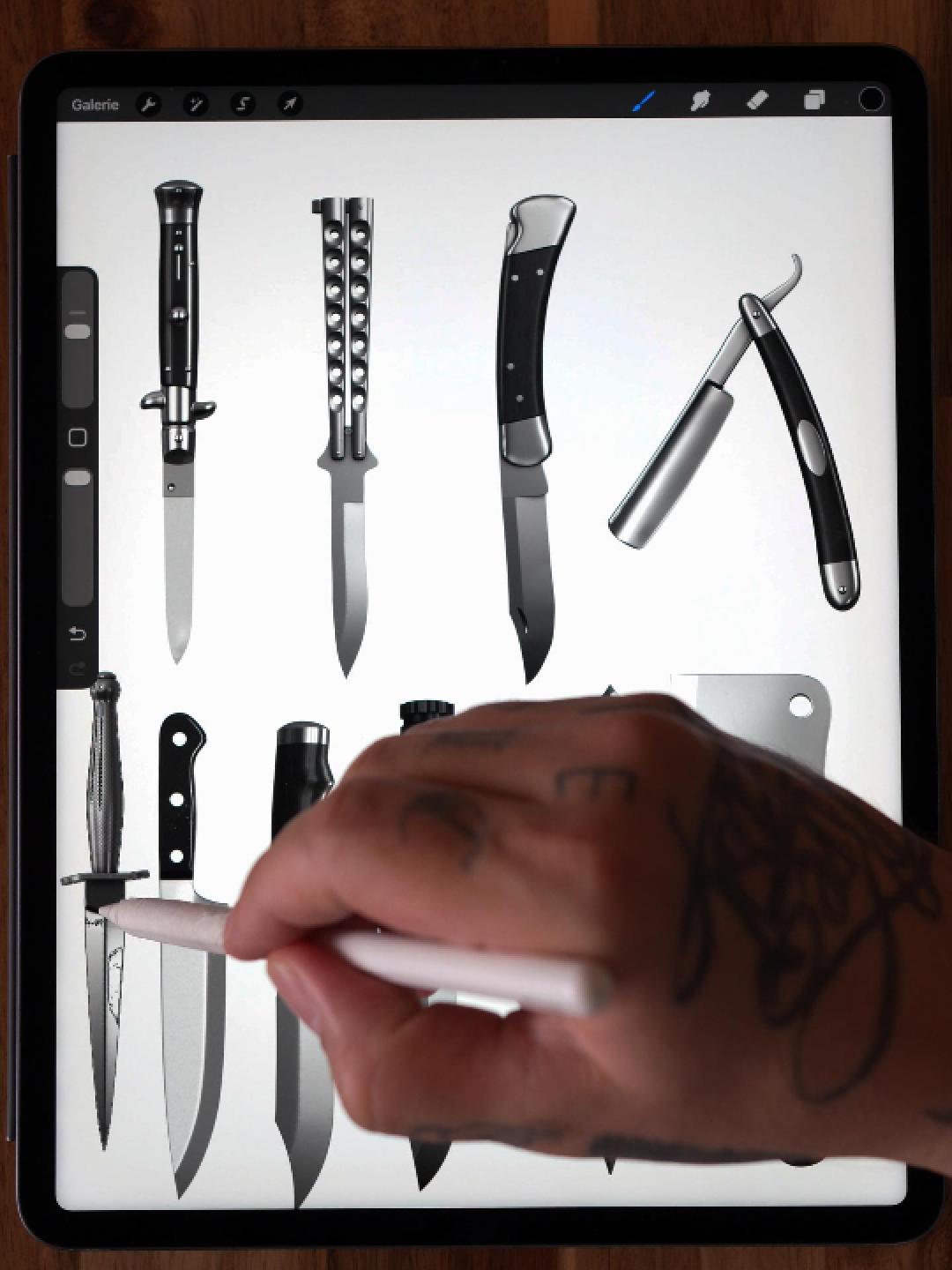 • 100 Procreate stamp brushes (digital download) – a complete arsenal of knife brushes for your iPad.